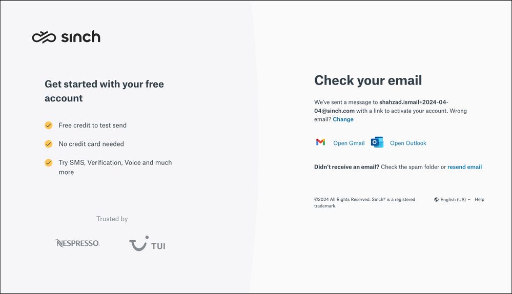 Sinch will send you a verification email. As requested on the page, check your email, open the email from Sinch and click the CONFIRM YOUR EMAIL button in the email. Sinch will verify your email address.