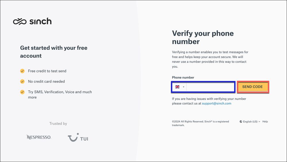 Enter your phone number and click SEND CODE. Sinch will send a 2FA code to your phone number.