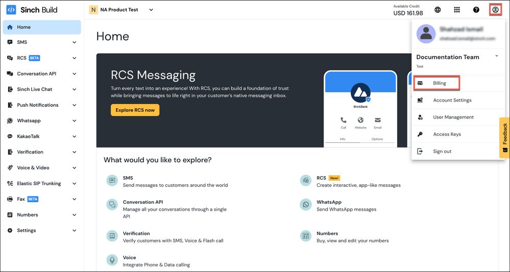 - Log in to the Sinch Build Dashboard and select your profile icon in the top right corner. Your profile menu is displayed: