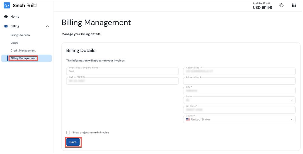 Note: If you encounter any issues when trying to update your billing address, please contact your account manager at onlineteam@sinch.com.
