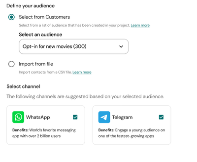 - Once you've defined your audience, you can select the channel for your campaign. Channels are suggested considering those present in the audience you selected. For example: if your selected audience has customers from Telegram and WhatsApp and both of these channels are connected in you project, you'll be able select them to proceed with the campaign sending.