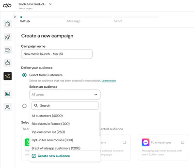 In this audience option, you can send campaigns for customers that already interacted with your channels and for customers that you have previously import into Sinch Engage. These customers can be found in the Customers page. In this page you can also create segmented audiences based on customer properties that you have defined. Check how to create audiences.