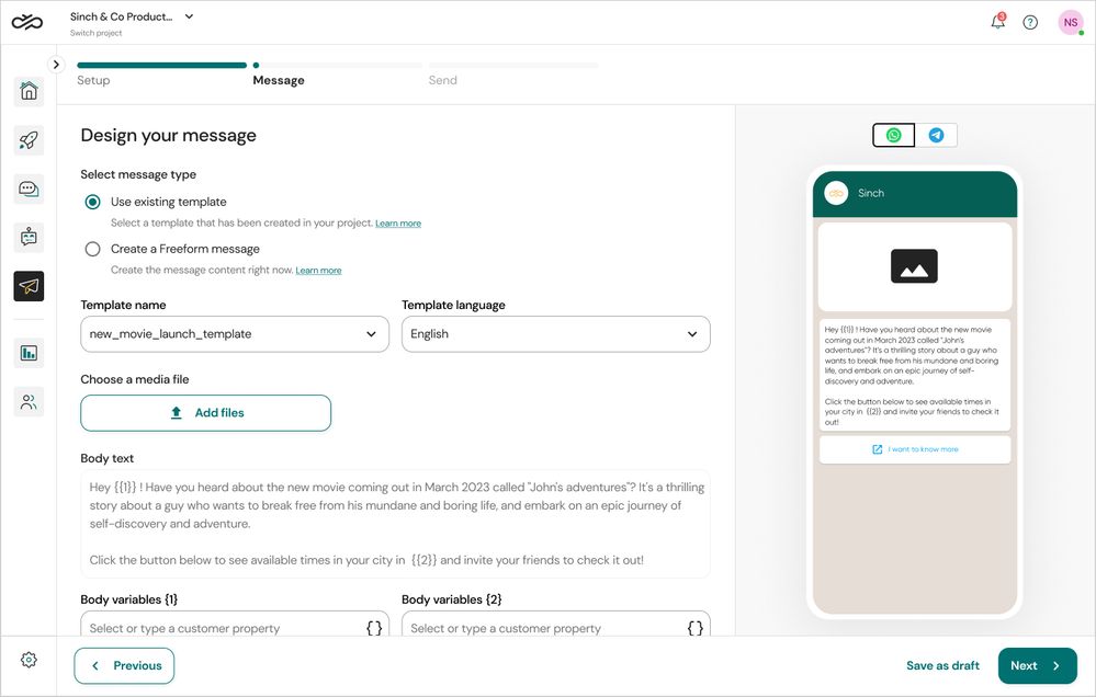 - A Body textarea will be pre-filled with the selected template's approved message.