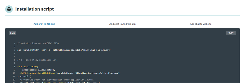 - Once you have finished customizing your chat client, continue to the Installation script section. Template code snippets for adding your chat client to an iOS app, Android app, or website are displayed, with the Client ID already populated in the appropriate sections:
