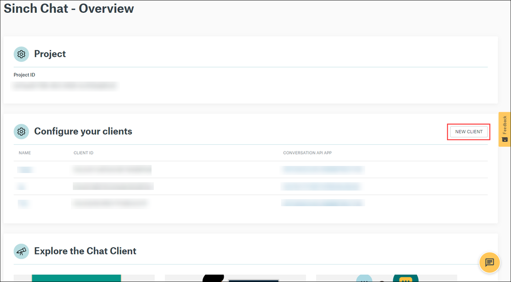 The Sinch Chat channel is automatically configured for every Conversation API app. In order to access the channel, you can use the Sinch Build Dashboard to create a Client ID, which must be included in the code of your chat client. The dashboard will also provide you with code snippets that help in the creation of your chat client.
