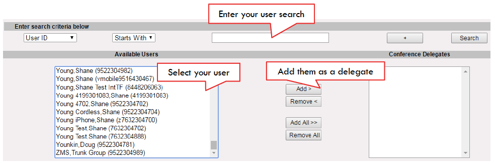 - In the Available Users column, select users to assign as conference delegates and click Add. The selected users are moved to the Conference Delegates column.