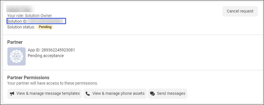 - Click Send request. The status of your request is Pending, and the new Partner Solution is displayed in the Partner Solutions panel.