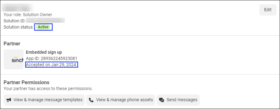 Note: You can continue with this procedure while waiting for Sinch to approve the request. Once Sinch approves the request, the corresponding Partner Solution is set to Active. If the status has not been updated within two business days after submitting the request, reach out to your Sinch Account Manager.